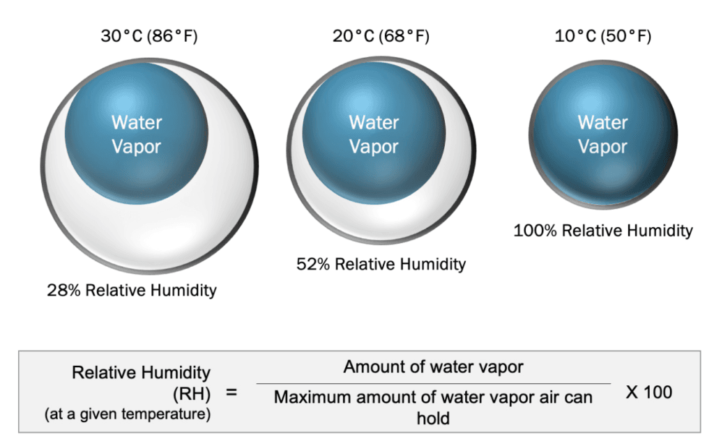 - Relative humidity (RH) is a measure of the amount of water vapor or moisture in the air compared to the maximum amount of water vapor (moisture) the air can hold at that temperature or saturation.