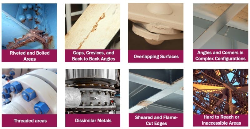 - Gaps, crevices, and back-to-back angles can also lead to early coating failures as moisture and other contaminants can become trapped inside.