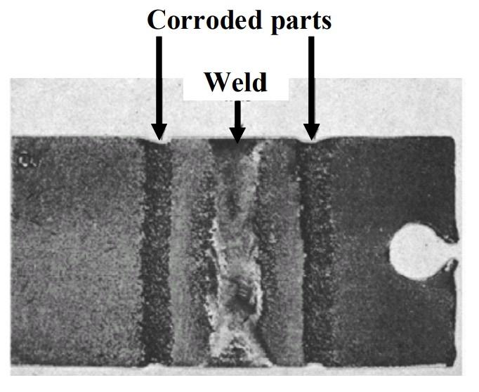 - The picture above shows a stainless steel which corroded in the heat affected zone a short distance from the weld. This is typical of intergranular corrosion in austenitic stainless steels.